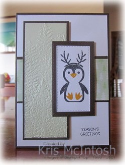 I cut Basic White and Early Espresso card using the Stitched Rectangle Dies. I stamped the antler image from the Penguin Place stamp set onto the Basic White rectangle using Memento Tuxedo Black ink. I stamped the penguin image from the same stamp set below the antlers using the same ink.