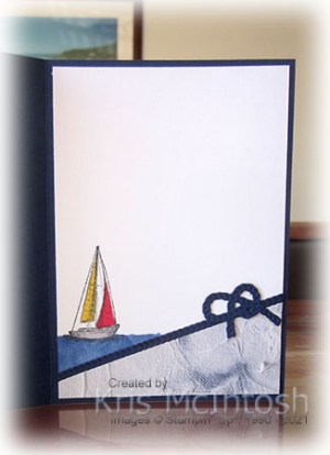 I stamped “happy father’s day” from the A Wish For Everything stamp set onto Basic White card using Night of Navy ink. I punched out the greeting using the Double Oval Punch. The greeting is attached to a Night of Navy scalloped oval punched using the Double Oval Punch. The greeting is attached to the card front using dimensionals where necessary. To decorate the inside of the card, I stamped the small sailing ship onto the lower left hand corner of Basic White card. I coloured the image using the same Stampin’ Blends as the image on the front of the card. I attached the piece of Designer Series Paper I had left after cutting the piece for the front of the card which is also on a diagonal. I cut another “rope” image from Night of Navy card using the Smooth Sailing Die. I also cut the “rope knot” from Night of Navy card using the same dies. I attached the “rope” and then the “knot” across the top of of the Designer Series Paper.