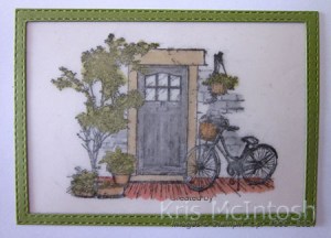 Yesterday on my Facebook Live, I shared a couple of ways to colour the beautiful image in the Feels Like Home stamp set which is another stamp set you can earn for FREE with a qualifying order during Sale-A-Bration. For today’s card, I stamped the image from the Feels Like Home stamp set onto Vellum paper using Memento Tuxedo Black ink. I turned the image over and coloured the back of the image. I used a Dark Old Olive Stampin’ Blend to colour the leafy images. I coloured the door using the Dark Smoky Slate Stampin’ Blend. I coloured the door frame using the light Soft Suede Stampin’ Blend.