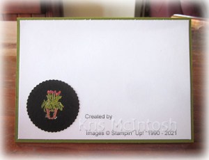 I love how this technique makes the image stand out so beautifully. I attached the image panel to Basic White card and then scored and folded Old Olive Card. To decorate the inside I stamped the single flower pot image from the Feels Like Home stamp set onto Basic Black card using Versamark ink. Again I sprinkled the image with White Embossing Powder and heat set it. The image is coloured using the Dark Old Olive, Dark Poppy Parade, Light Calypso Coral, Light Soft Suede and Light Smoky Slate Stampin’ Blends. I cut out the image using one of the scalloped circles from the Layering Circles Dies and attached it to the lower left hand corner of Basic White card.