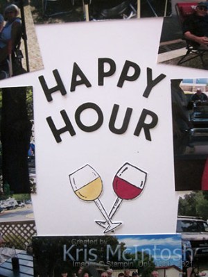 I kept it pretty simple because the photos tell the story. The title is cut from Basic Black card using the Playful Alphabet Dies and attached in the centre of the photos. I stamped the wine glass image from the retired Half Full stamp set twice onto Basic White card. I coloured in one glass using the Dark So Saffron Stampin’ Blend and the other using the Dark Cherry Cobbler Stampin’ Blend. I cut out the wine glasses and attached them below the title. I added a very small amount of hand written journaling below the photos on the bottom of the page. Simple but gives me such happy memories.