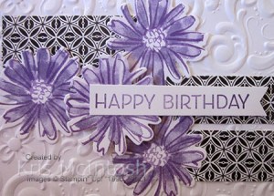 Two of these pieces of Designer Series Paper are cut using the Stitched Rectangle Dies. I stamped the outline flower image from the Colour & Contour stamp set onto Basic White card using Gorgeous Grape ink. I stamped the fill flower image from the same stamp set using Highland Heather ink. I cut out the flowers using the co-ordinating Scalloped Contour Die and attached three of the flowers flat to the card front.