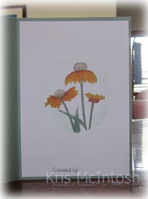 I cut out the image using the Layering Circle Dies. The image is attached to a Soft Succulent scalloped circle cut using the same dies and then the card front using dimensionals where necessary. I stamped “happy birthday” from the Art Gallery stamp set onto Basic White card using Soft Succulent ink and cut it out using one of the Stitched Rectangle Dies. The greeting is attached to the card front using dimensionals on the outside edges only. To decorate the inside of the card, I cut the same size circle as I used for the Basic White panel on the card front from a post-it note using the Layering Circle Dies. I attached the post-it-note to Basic White card and stamped the image from the Natures Harvest stamp set using Smoky Slate ink. Keeping the post-it-note in place, I coloured the image using the same Stampin’ Blends as I used on the card front. With the post it note still in place, I used a Blending Brush to add a little Pool Party ink around the inside of the circle.