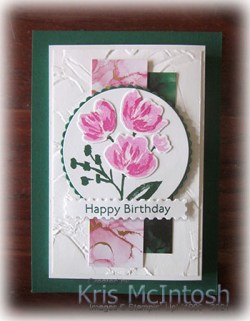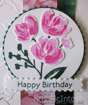 I stamped the small floral image from the Art Gallery stamp set onto Basic White card using Magenta Madness ink which I stamped off first. I stamped the small detailed flower over the top using Magenta Madness ink which I did not stamp off. I cut out the image using the Floral Gallery Dies. I cut out the flowers and attached them to the card front over the stamped images. I stamped “happy birthday” from the Art Gallery stamp set onto Basic White card using Shaded Spruce ink.