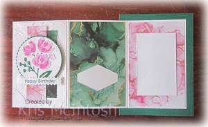 I cut out the greeting using the Floral Gallery Dies and attached it to the card front using dimensionals on the ends only. The gift card panel is another piece of Expressions in Ink Specialty Designer Series Paper which I punched using the Tailored Tag Die. The last panel has a piece of the Expressions in Ink Specialty Designer Series Paper with a Basic White panel cut using the Stitched Rectangle Dies.