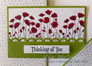 I stamped the poppy image from the Painted Poppies stamp set onto Basic White card using Memento Tuxedo Black ink. I coloured the poppies using the Dark Poppy Parade Stampin’ Blend. I cut Granny Apple Green card using the largest rectangle from the Scalloped Contour Dies and attached the panel across the bottom of the stamped Basic White card. I stamped the greeting from the Quiet Meadow stamp set onto Basic White card using Memento Tuxedo Black ink.