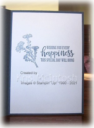 I coloured the image using Misty Moonlight, Dark Daffodil Delight and Dark Just Jade Stampin’ Blends. I cut out the image using the co-ordinating Harvest Die and attached it to the Basic White card. To decorate the inside of the card, I stamped the smaller floral image from the Nature’s Harvest stamp set onto Basic White card using Misty Moonlight ink. I stamped the greeting from the Peaceful Moments stamp set beside the floral image using Misty Moonlight ink. The stamped Basic White panel is attached to the inside of the Misty Moonlight card base.