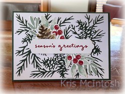 I stamped the berry image from the Christmas Season stamp set using Soft Succulent for the stems and Cherry Cobbler for the berries. I stamped one small pine cone from the Christmas Season stamp set using Early Espresso for the detailed image and Crumb Cake ink for the more solid image. All of the images were cut out using the co-ordinating Seasonal Labels Die. I attached two leaves to the top left hand corner of the card front and two leaves to the bottom left hand corner.