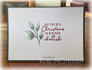 I attached a berry image over each set of leaves and added the pine cone image to the top left hand corner. I stamped the greeting from the Christmas to Remember stamp set onto Basic White card using Cherry Cobbler ink. I cut out the greeting using the Seasonal Labels Die and attached it to the card front using dimensionals. To decorate the inside of the card, I stamped the greeting from the Christmas to Remember stamp set onto Basic White card using Cherry Cobbler ink. I stamped the two step leaf from the Christmas Season stamp set next to the greeting using Soft Succulent ink.