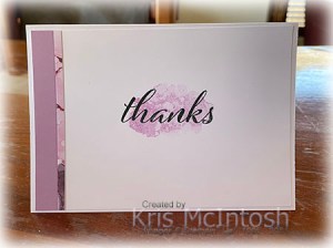 I stamped the greeting from the stamp set included in the kit onto one of the die cut labels, also from the kit, using the Evening Evergreen Stampin’ Spot included in the kit. The greeting is attached to the card front using dimensionals. To decorate the inside of this card, I attached a narrow strip of card which I had left over from the card base to the left hand side of Basic White card. I stamped the background image from the included stamp set onto the centre of the Basic White card using Fresh Freesia ink which I had stamped off onto scrap paper first. I stamped “thanks” from the Artistically Inked stamp set over the background image using Evening Evergreen ink.