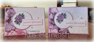 I left the other one plain. The greetings are attached to the card fronts using dimensionals where necessary. For the card with the coloured edge around the greeting, I used the Dark Fresh Freesia Stampin’ Blend to add colour to three large Basic Pearls. I attached one to the centre of the flower and the other two to the card front. For the second card, I used the Dark Fresh Freesia Stampin’ Blend to colour three large Basic Rhinestones, one for the centre of the flower and the other two for the card front. To decorate the inside of these cards, I took the remaining piece of the card front and cut it in half, I attached a strip of Fresh Freesia card behind one long edge and attached the panels to the left hand edge of a Basic White layer. I stamped the background image from the included stamp set onto the Basic White card using Fresh Freesia ink which I stamped off onto scrap paper first. I stamped the greeting from the included stamp set over the top using the Evening Evergreen Stampin’ Spot included in the kit. I love the way these cards turned out and I love getting more for my dollar by turning one card into three! I have to thank Vicky Wright for the layout I used on the two matching cards.