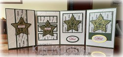 For each card I embossed a piece of Basic White card using the Painted Texture 3D Embossing Folder and attached it to scored and folded Evening Evergreen card. I attached all of the pieces of Designer Series Paper to the co-ordinating piece of Evening Evergreen card before attaching them to the card fronts. I die cut four of the largest star from the Christmas Trimmings Dies from Evening Evergreen card. I also die cut Gold Foil card using the largest detailed star from the Christmas Trimmings Dies. I attached the detailed stars to the Evening Evergreen stars and then to each card front using dimensionals. For two of the cards, I stamped “seasons greetings” from the Tidings and Trimmings stamp set onto Basic White card using Cherry Cobbler ink.