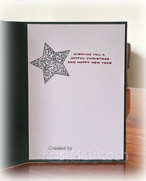 I cut out the greetings using my paper snips and attached the greetings to the centre of two of the stars. For two more cards, I stamped “Noel” from the Tidings and Trimmings stamp set onto basic White card using Cherry Cobbler ink and punched them out using the Double Oval Punch. I cut a scalloped oval from Evening Evergreen card using the same punch. I attached the greeting to the centre of the scalloped Evening Evergreen oval and then the card front using dimensionals. For the last card, I punched Gold Foil card using the scalloped oval from the Double Oval Punch. I attached the last greeting to the centre of the Gold Foil scalloped oval and then the card front using dimensionals. To decorate the inside of the cards, I stamped the star image from the Tidings and Trimmings stamp set onto Basic White card using Evening Evergreen ink. I stamped the greeting from the Tidings and Trimmings stamp set beside the greeting using Cherry Cobbler ink.