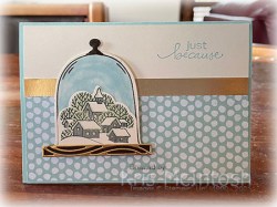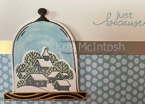 I attached a strip of Gold Foil card so that the edge touches the top of the Designer Series Paper. I stamped the cloche outline from the Classic Cloche stamp set onto Very Vanilla card using Early Espresso ink and used the co-ordinating Cloche Die to cut it out. I coloured the inside of the cloche image using a Light Balmy Blue Stampin’ Blend. I stamped the outline village image from the Classic Cloche stamp set onto Very Vanilla card using Memento Tuxedo Black ink.
