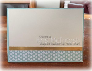 I stamped the solid house fill image using Smoky Slate ink and the greenery image using Soft Sea Foam ink. I cut out the village scene using the co-ordinating Cloche Die and attached it inside the coloured cloche image. I cut Early Espresso card using the Cloche Die to create the solid shelf and Gold Foil card using the Cloche Die to create the decorative overlay. I attached the two shelf images together before attaching them to the stamped cloche image. The whole image panel is attached to the card front using dimensionals. To decorate the inside of the card, I attached a piece of the same patterned Pattern Party Designer Series Paper across the bottom of Very Vanilla card. I attached a narrow strip of Gold Foil card so that the edge touches the top of the Designer Series Paper.