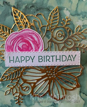 I attached two die cut Gold Foil leaves to the back of the flower before attaching it to the card front. I stamped ”happy birthday” from the Artistically Inked stamp set onto Basic White card using Just Jade ink. I cut out the greeting using the Stitched Rectangle Dies and attached it to the card front using dimensionals.