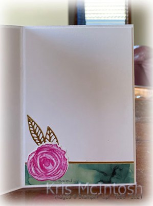 To decorate the inside of the card, I attached a narrow strip of Gold Foil card behind one long edge of Expressions in Ink Specialty Designer Series paper, before attaching it to the bottom of Basic White card. I stamped the smaller flower from the Artistically Inked stamp set onto Basic White card using Magenta Madness ink. I attached two Gold Foil die cut leaves to the back of the flower before attaching it over the Designer Series Paper.