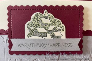 I die cut Merry Merlot card using the same rectangle from the Scalloped Contour Dies and attached it to the card front using dimensionals. I stamped the outline village image from the Classic Cloche stamp set onto Very Vanilla card using Memento Tuxedo Black ink. I stamped the house fill image using Smoky Slate ink and the tree fill image using Soft Sea Foam ink. I cut out the image using the co-ordinating Cloche Die. I attached the die cut panel to the centre of the scalloped rectangle. I stamped the greeting from the Classic Cloche stamp set onto Smoky Slate card using Smoky Slate ink.