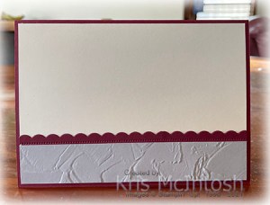 I used the Tailored Tag punch to cut a “v” in each end of the greeting banner before attaching it to the card front using dimensionals. To decorate the inside of the card, I cut another narrow strip of Merry Merlot card using the scalloped rectangle die from the Scalloped Contour Dies. The scalloped edge is attached behind one long edge of a strip of Smoky Slate card embossed using the Painted Texture 3D Embossing Folder. The whole panel is attached across the bottom of Very Vanilla card.