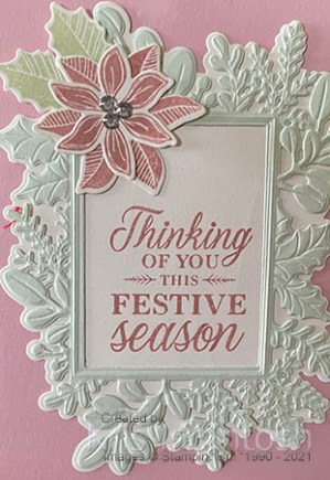 Today’s card is made using the fancy fold that I shared in my Facebook Live this week. I began by cutting Very Vanilla card using the Merriest Frames Dies. I also cut Soft Sea Foam using the detailed die from the Merriest Frames Dies. I cut the centre from the Soft Sea Foam die cut using the rectangle die and then embossed the panel using the Merriest Frames Hydrid Embossing Folder. I attached the Soft Sea Foam embossed panel to the Very Vanilla die cut and then scored and folded Blushing Bride card. I stamped the greeting from the Merriest Moments stamp set inside the die cut rectangle using Blushing Bride ink.