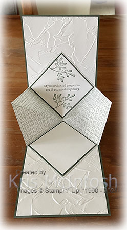 I attached the image panel to an Evening Evergreen scalloped circle cut using the same dies. The image is attached to the card front using dimensionals where necessary. To decorate the inside of the card, I embossed two panels of Basic White card using the Painted Texture 3D Embossing Folder and attached them to the inside of the Evening Evergreen card base. I scored and folded a square of the Ever Eden Specialty Designer Series Paper and attached it to the inside of the card. I stamped the greeting from the Eden’s Garden stamp set onto a small square of Basic White card using Evening Evergreen ink. I stamped one of the leafy images from the same stamp set above and below the greeting using Evening Evergreen ink. I attached the stamped panel to Evening Evergreen card and then the Designer Series Paper. I attached a piece of Basic White card to Evening Evergreen card which I also attached to the Designer Series Paper. I left this Basic White panel un-decorated so that I could write a message here.
