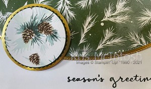 I also cut Gold Foil card using the same die and attached it behind the edge of the Designer Series Paper. The panel is attached to the top of the stamped Basic White card. I flipped over the Painted Christmas Designer Series Paper and used a Layering Circle Die to cut out a section of the Designer Series Paper. I attached the Designer Series Paper to an Evening Evergreen scalloped circle and a Gold Foil circle, also cut using the Layering Circle Dies.