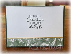 The image panel is attached to the card front using dimensionals. To decorate the inside of the card, I stamped another greeting from the Christmas to Remember stamp set onto Basic White card using Evening Evergreen ink. I attached a narrow strip of Gold Foil card behind one long edge of Painted Christmas Designer Series Paper and attached it across the bottom of the stamped Basic White card.