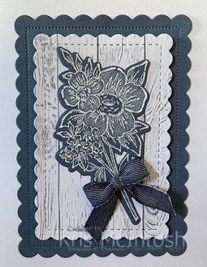 I stamped the image from the Blessings of Home stamp set onto Misty Moonlight card using Versamark. I sprinkled the image with White Embossing Powder and heat set it. I coloured parts of the image using a White Watercolour Pencil, in fact only the two large flowers. I cut out the image using the co-ordinating Flowers of Home Die and attached it to the card front.