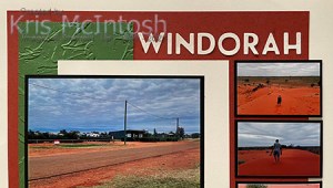 Today’s page shows off some photos from our stay at Windorah in far western Queensland. This is a small, friendly community. I attached a piece of Cajun Craze 12″ x 12″ card which I cut down slightly to a Very Vanilla 12″ x 12″ page. I embossed a panel of Garden Green card using the Painted Texture 3D Embossing Folder and attached it to the left hand side of the page. I created the journaling on my computer and printed it onto Very Vanilla card which I attached to the page so that it partially covered the embossed card.