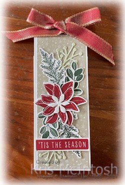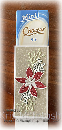 I layered all of the leaves and flowers onto the front of the Chocolate Slider. I stamped the greeting from the Christmas to Remember stamp set onto Basic White card using Cherry Cobbler ink and used my Paper Snips to cut it out. The greeting is attached using Mini Dimensionals. To decorate the inside of the slider I attached a piece of the same pattern Christmas Tidings Designer Series Paper. I stamped and die cut several of the same leaves, flowers and berries as I did for the front and layered them onto the Designer Series Paper. I tied my Chocolate Slider closed with a length of Cherry Cobbler and Gold Metallic Edged Ribbon.