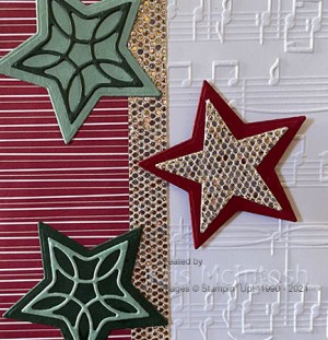 I also attached a narrow strip of the Be Dazzling Specialty Paper (Sale-a-bration Freebie) next to the Designer Series Paper. The whole panel is attached to scored and folded Cherry Cobbler card. I used the Christmas Trimmings Dies to cut a solid star from Soft Succulent, Cherry Cobbler and Evening Evergreen card.