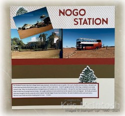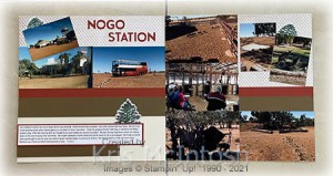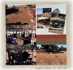We have done many tours with the Outback Pioneers while staying in Longreach but we have never done the Nogo Station tour until this last visit. I cut a piece of In Good Taste Designer Series Paper in half and attached one half to the top of two Very Vanilla 12″ x 12″ pages. I attached a strip of Cajun Craze below the Designer Series Paper on both pages. I also attached a strip of Soft Suede card across both pages below the Cajun Craze Strip.