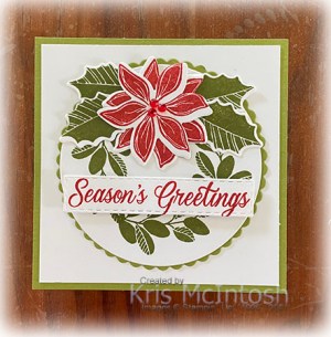 The first panel uses the stamparatus to create a small wreath using a leaf image from the Merriest Moments stamp set as a background. The other images and greetings also come from this stamp set. I also added three Real Red Rhinestones to the flower centre.