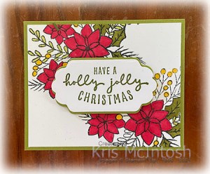 The lower left hand panel uses the Words of Cheer stamp set and the Christmas to Remember stamp set also with the Seasonal Labels Dies. The image is coloured using the Dark & Light Real Red, Dark & Light Old Olive and Dark Daffodil Delight Stampin’ Blends.