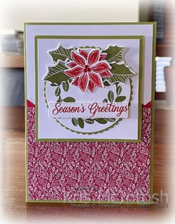 I attached the second half of the Real Red border piece behind one long edge of a narrow strip of Tidings of Christmas Designer Series Paper. The Designer Series Paper panel is attached across the bottom of the stamped Basic White card. Since I had a couple of kits for this project already cut it was easy to create this card with all the pieces ready to go.