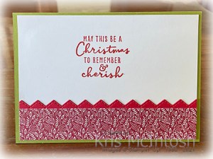 I attached one half behind a piece of Christmas Trimmings Designer Series Paper before attaching the panel across the bottom of the embossed Basic White card. The whole piece is attached to scored and folded Real Red card.
