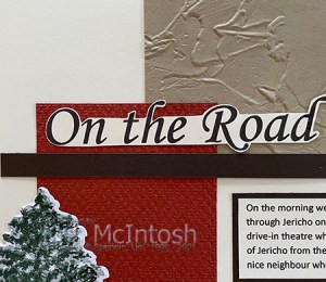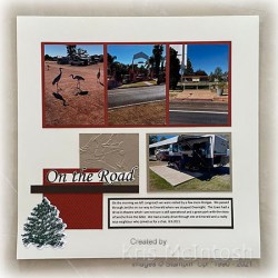 Today’s page shows off some photos from our drive from Longreach to Emerald. Our day started with a visit by four friendly Brolgas while we were packing up. On the drive we passed through Jericho, a lovely little town with it’s own Drive-in movie theatre (not sure it still operates). We arrived mid afternoon at Emerald and had a lovely drive-through site. Our neighbour was a lovely man who joined us for a chat while we had a couple of drinks before dinner. I printed my photos to 3″ x 4″ size and attached three of them to Cajun Craze card before attaching them to a Very Vanilla 12″ x 12″ page. The last photo is attached to Crumb Cake card and then the page.