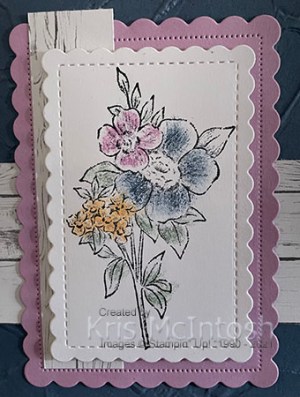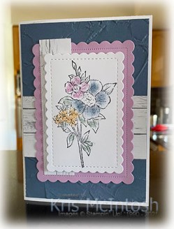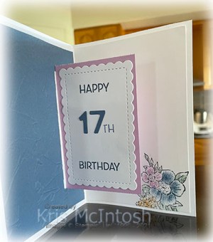 My eldest granddaughter celebrated her 17th birthday recently and today I thought I would share the card I made for her with you. I embossed Misty Moonlight card using the Painted Texture 3d Embossing Folder before attaching a piece of the Heart & Home Designer Series Paper across the panel. The whole piece is attached to scored and folded Thick Basic White card. I cut Fresh Freesia card using one of the Scalloped Contour Dies. I attached a narrow strip of another piece of Heart & Home designer Series Paper down the left hand side before attaching the panel to the card front.