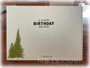 I stamped the detailed treeline image over the top using Pear Pizzazz ink. I used a Blending Brush to colour the Very Vanilla card below the treeline using Pool Party ink. I used a Blending Brush to add colour to the area above the mountains using Balmy Blue ink. I stamped the birds from the Mountain Air stamp set above the mountains using Early Espresso ink. I stamped the greeting from the Tasteful Touches stamp set using Early Espresso ink.
