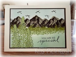 I stamped the detailed treeline image over the top using Pear Pizzazz ink. I used a Blending Brush to colour the Very Vanilla card below the treeline using Pool Party ink. I used a Blending Brush to add colour to the area above the mountains using Balmy Blue ink. I stamped the birds from the Mountain Air stamp set above the mountains using Early Espresso ink. I stamped the greeting from the Tasteful Touches stamp set using Early Espresso ink.