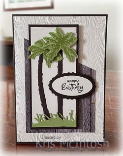 Today’s card is another one I made using the Paradise Palms Bundle. To begin I added a piece of In Good Taste Designer Series Paper to Very Vanilla card before embossing with the Timber 3D Embossing Folder. The panel is attached to scored and folded Early Espresso card. I cut Early Espresso card using the palm tree trunks from the Palms Dies which I attached to Very Vanilla card. I die cut Pear Pizzazz card using the grass die from the Palms Dies and attached it across the bottom of the Very Vanilla card, covering the ends of the palm tree trunks.