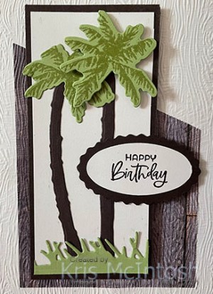 I stamped the palm leaves from the Paradise Palms stamp set onto Pear Pizzazz card using Pear Pizzazz ink before cutting using the co-ordinating Palms Dies. I attached one set of leaves flat onto the tree stem and the other using dimensionals. I attached the Very Vanilla image panel to Early Espresso card and then the card front using dimensionals.