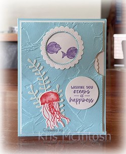 This week in my Facebook Live, I shared some cards made using the Seas the Day Bundle from the newly released Mini Catalogue. I also used the Give It a Whirl Dies to create today’s card. I cut Pool Party card using the card front die from the Give It a Whirl Dies before embossing the panel using the Painted Texture 3D Embossing Folder. I cut the turning mechanism from Very Vanilla card and stamped one of the fish images from the Seas The Day Bundle using Highland Heather ink, the starfish using Blushing Bride ink and the crab image using Calypso Coral ink, making sure that the images would show through the window.