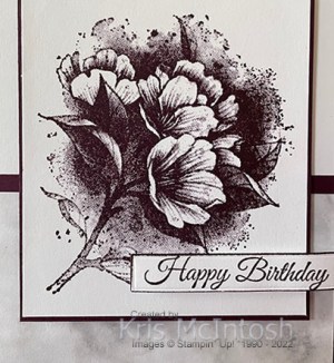 I stamped the floral image from the Calming Camellia stamp set onto Basic White card using Blackbery Bliss ink. I attached the image panel to Blackberry Bliss card and then the card front using dimensionals. I stamped “happy birthday” from the Calming Camellia stamp set onto Basic White card using Blackberry Bliss ink.