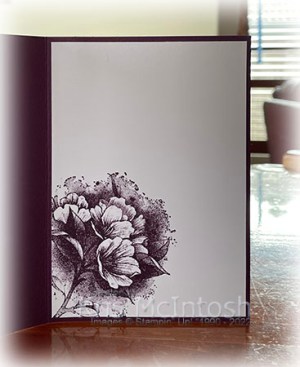 I cut out the greeting using the label die from the Beautiful Trees Dies. I touched the edges of the label to the Blackberry Bliss ink pad before attaching to the card front using dimensionals. I doubled up the dimensionals underneath the right hand edge so it would sit properly. To decorate the inside of the card, I stamped the same floral image onto the lower left hand corner of Basic White card using Blackberry Bliss ink. This is a distinctive stamp set so you get a lot of detail just using one colour on these stamps. I hope you are getting as excited as I am for all the gorgeous things you can earn for free during Sale-a-Bration.