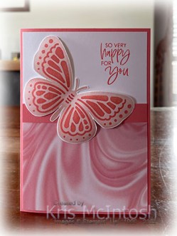 I used the layering masks and Blending Brushes to create a butterfly on Basic White card using Blushing Bride and Flirty Flamingo inks. I cut out the butterfly and attached it to the card front using dimensionals underneath the wings and Tombow Multipurpose Liquid glue underneath the body and antennae.