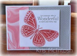 Today’s card was created using the Butterflies & Flowers Layering Decorative Masks. I really love these masks because they are not just background masks, you can use them to create the focal images on your cards. For today’s card, I embossed Smoky Slate card using the Tasteful Textile 3D Embossing Folder and attached a piece of Simply Marbleous 6″ x 6″ Designer Series Paper to the left hand side.