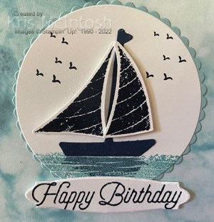 Today I have another card to share with you using the Let’s Set Sail Bundle, which I shared this week on my Facebook Live. I attached a piece of Simply Marbleous 6″ x 6″ Designer Series Paper to Night of Navy card and then scored and folded Balmy Blue card. I cut a circle from Basic White card using the Layering Circle Dies and stamped the sea image from the Let’s Set Sail stamp set across the bottom of the circle. I used the Sailboat Builder Punch to punch the ship and mast from Night of Navy card before attaching it to the stamped circle.