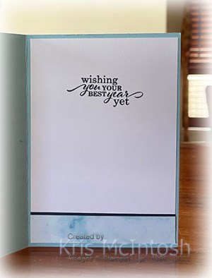 I attached the stamped circle to a Balmy Blue scalloped circle cut using the Layering Circle Dies before attaching the panel to the card front. I stamped “happy birthday” from the Special Moments stamp set (you can earn this stamp set for free with a qualifying order during Sale-A-Bration) onto Basic White card using Night of Navy ink. I used the banner die from the Bouquet of Love Dies to cut out the greeting before attaching it to the card front using dimensionals. To decorate the inside of the card, I stamped the greeting from the Best Year stamp set onto Basic White card using Night of Navy ink. I attached a narrow strip of Night of Navy card behind one long edge of a strip of Simply Marbleous Designer Series Paper before attaching it across the bottom of the stamped Basic White card.