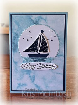 Today I have another card to share with you using the Let’s Set Sail Bundle, which I shared this week on my Facebook Live. I attached a piece of Simply Marbleous 6″ x 6″ Designer Series Paper to Night of Navy card and then scored and folded Balmy Blue card. I cut a circle from Basic White card using the Layering Circle Dies and stamped the sea image from the Let’s Set Sail stamp set across the bottom of the circle. I used the Sailboat Builder Punch to punch the ship and mast from Night of Navy card before attaching it to the stamped circle.